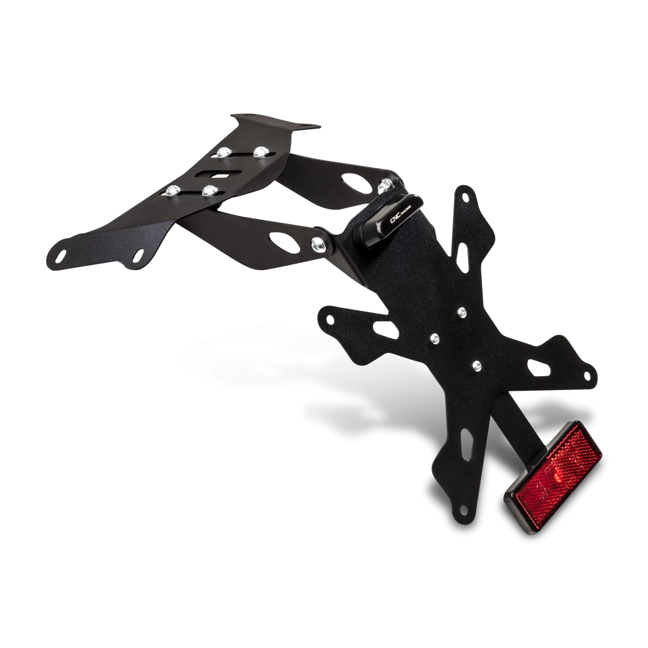 Adjustable steel plate holder including support plate, license plate light LED, supports turn signals reflector.