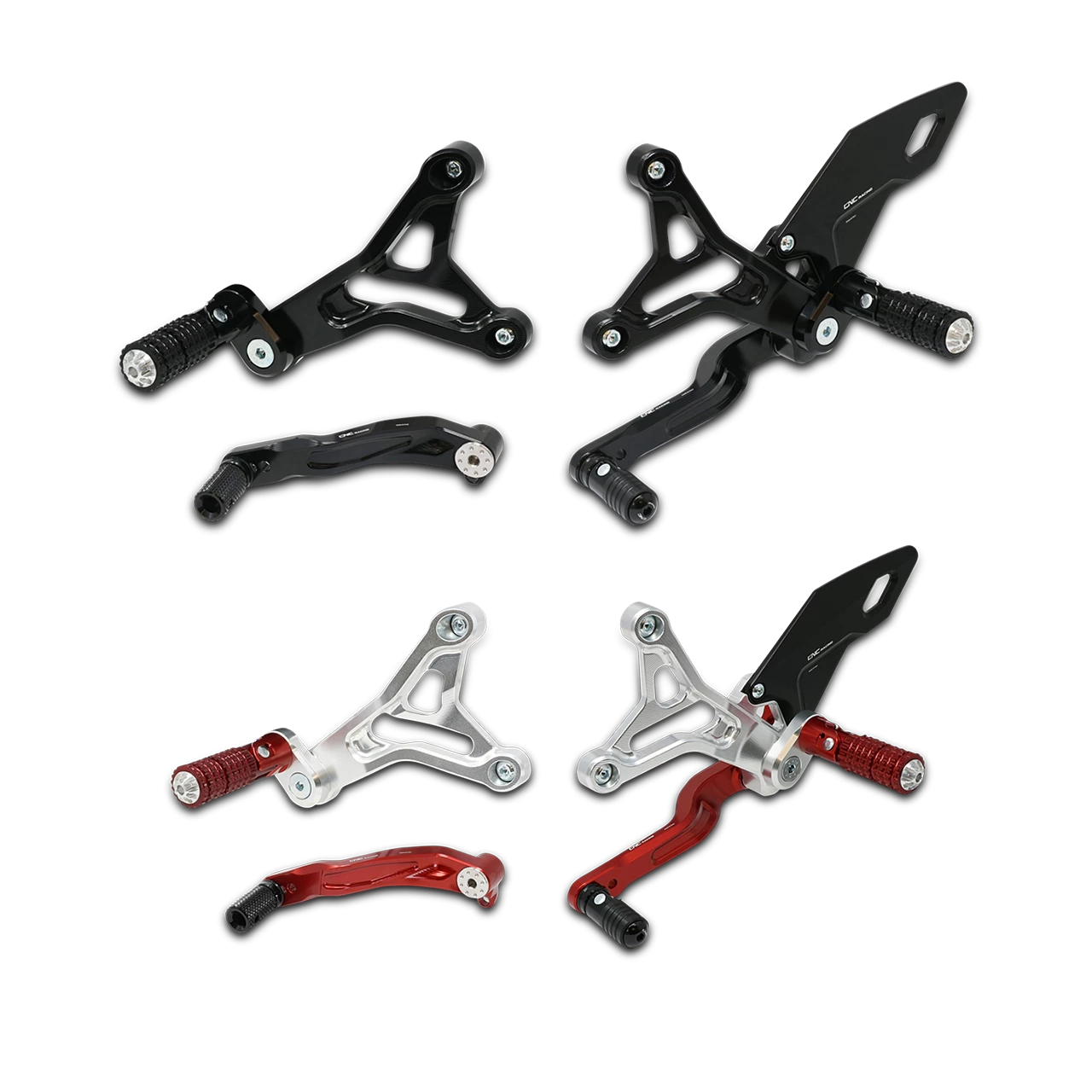 CNC Racing adjustable rear sets kit, fully CNC machined. The shift and brake levers, as well as the folding footrest are both equipped with CNC Racing adjustable and foldable rod. The kit also includes stainless steel screws.
