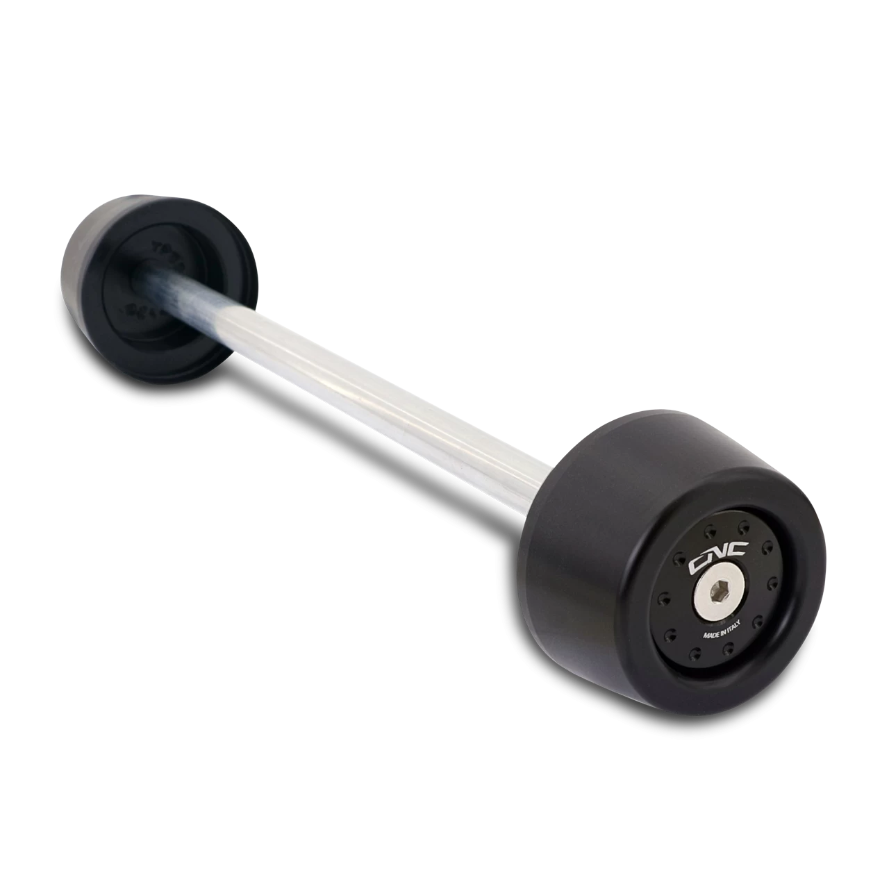 Buffer rear wheel machined from light alloy billet with solid plastic heads. They protect the forks and swingarm in the event of spills or slides and give the bike more of a race-style design.
