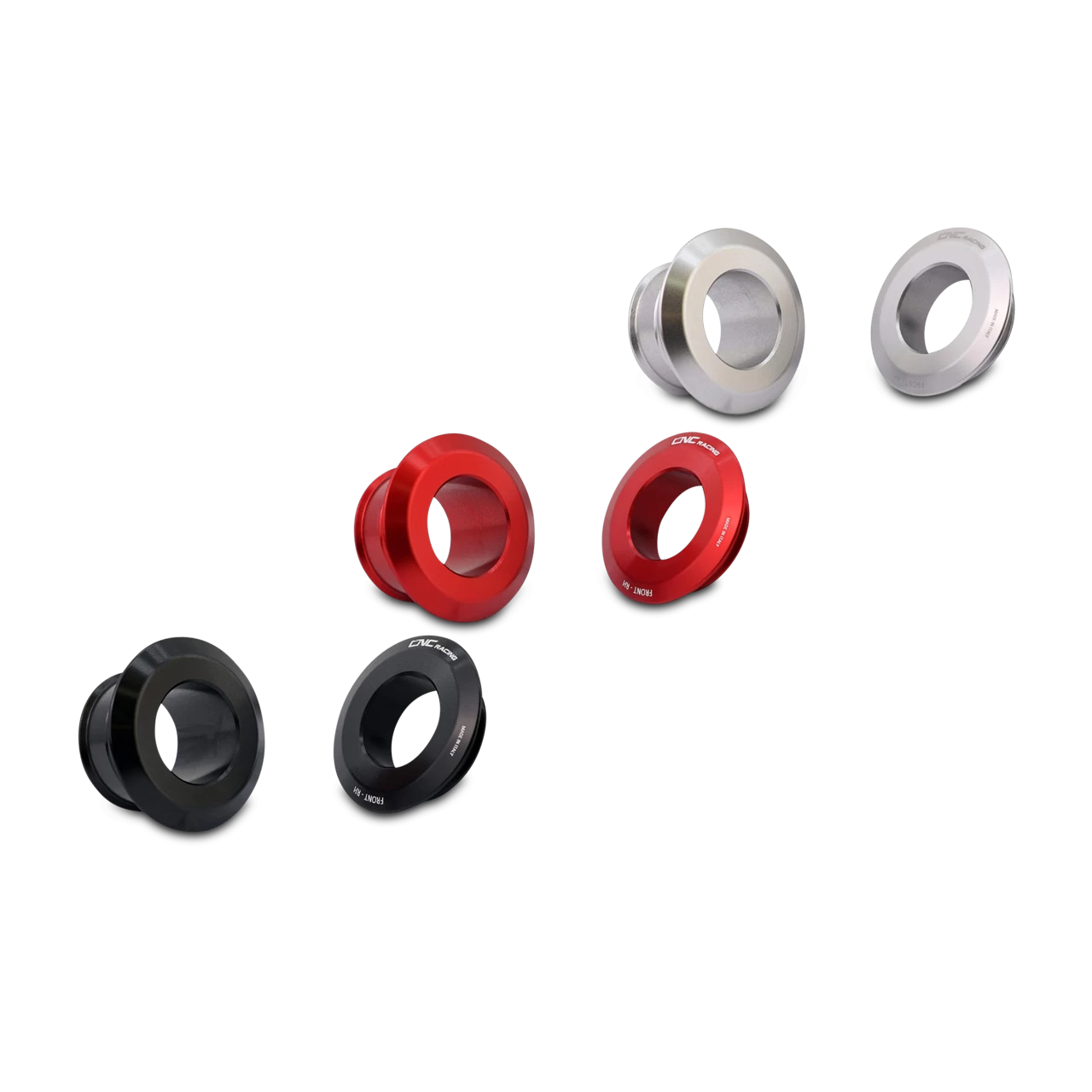 The CNC Racing Bushing kit for front wheel Ducati is made in light alloy, machined from solid and then anodized. They allow faster operation on the front wheel by remaining locked on the wheel hub without falling like the original. In addition, the design avoids any jamming during assembly.