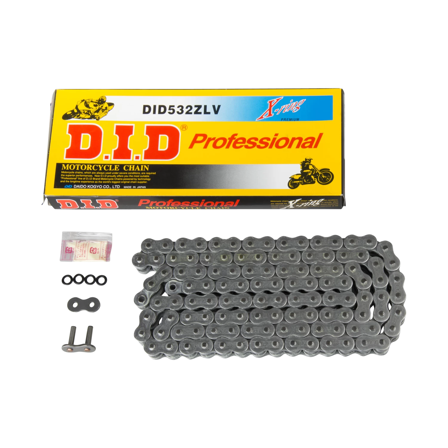 D.I.D’s X-ring chains seal in their unique “V” grease while shutting out dirt and dust. With proper maintenance, this X-ring chain will sustain minimal wear and last up to 10x longer than your average chain. All D.I.D X-ring seals minimise friction by 50%, and guarantee a lifespan 50-100% longer than typical O-ring chains.