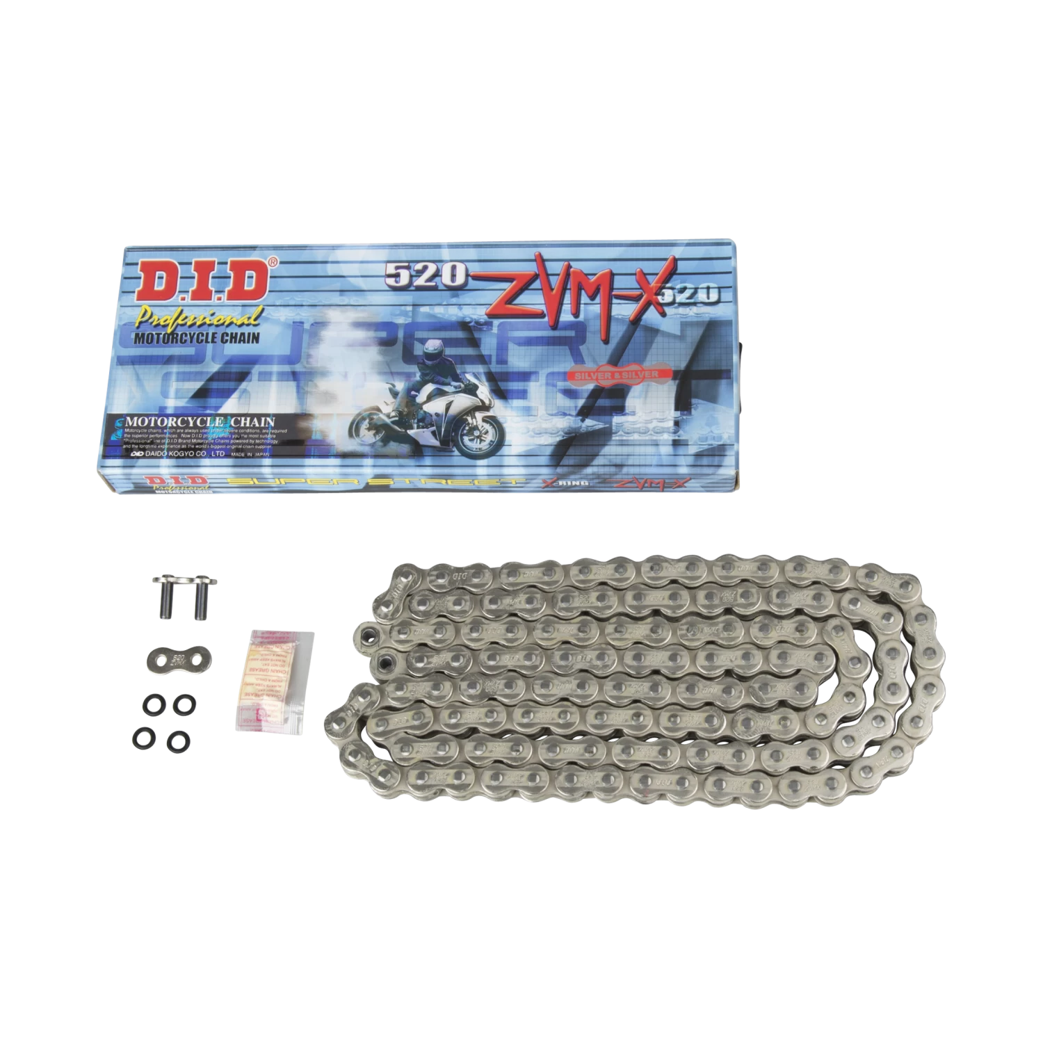 D.I.D X-ring seals provide 50% less friction keeps 50-100% longer than a standard O-ring chain. Manufactured Specifically with solid steel rolls and bushings that are high precision cylindrical and precise tolerances which helps to create a lower chain friction. ZVMX chain is developed by D.I.D’s engineers, and has undergone various tests to obtain maximum strength and durability.