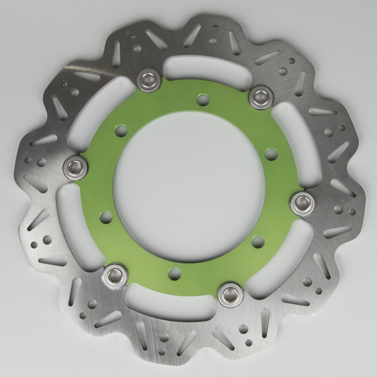 This fully floating rotor is made of premium tempered stainless steel which has extreme wear resistance. Aggressively styled, with a surface designed to remove dirt effectively. The design also provides maximum cooling even under extreme braking.