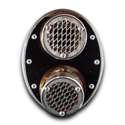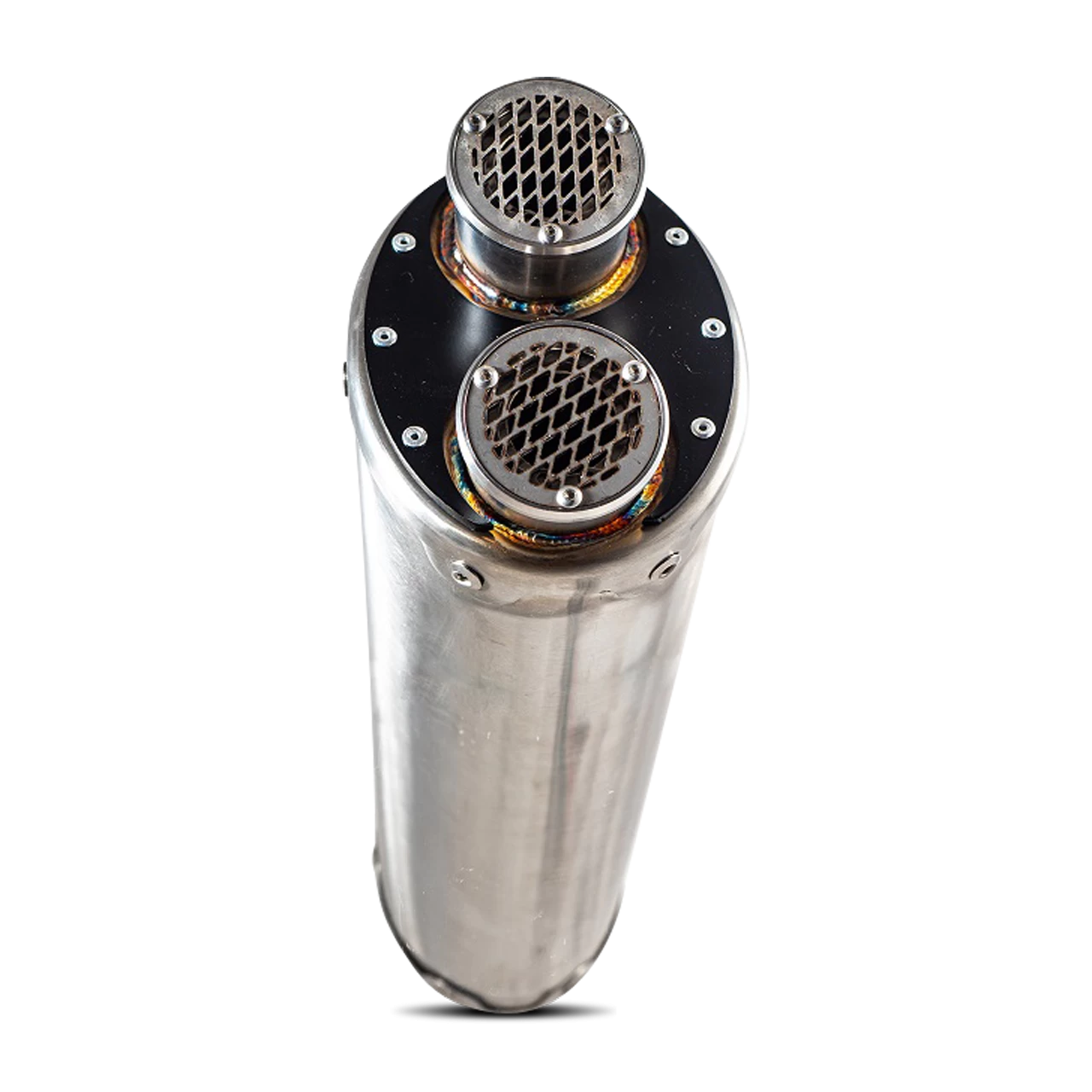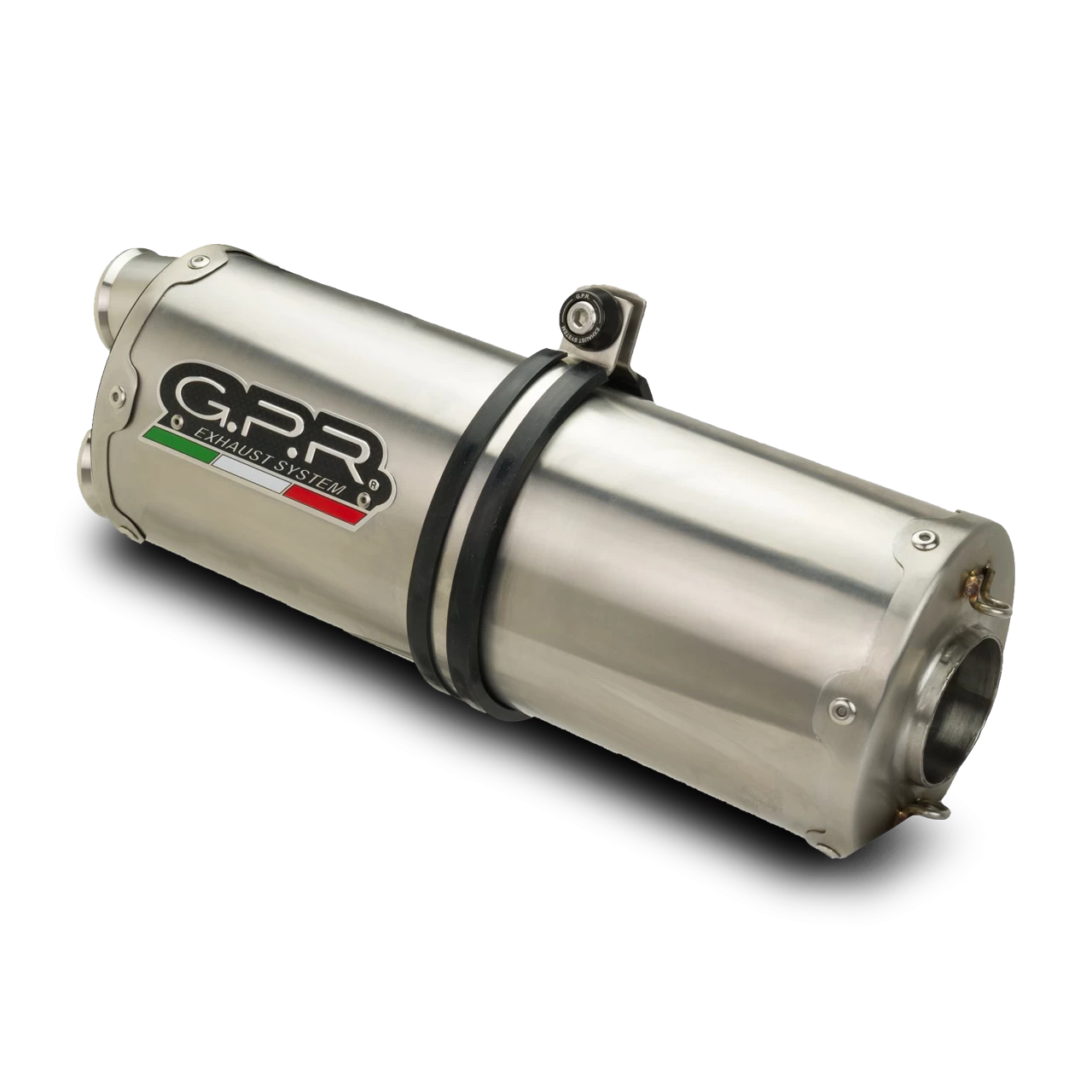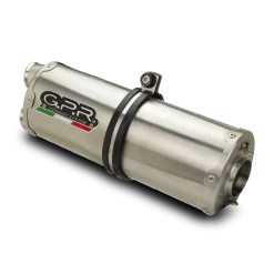DUAL INOX, developed thanks to the victories in the Moto3 World Championship, made of hand-brushed stainless steel, OVAL shape with a diameter of 100mm, supplied with a removable racing grille, CNC-machined bottoms. Original G.P.R. product, developed thanks to a long experience in World Motorbikes Championship, propose an innovative design, performance increase, relevant weight saving and a motorbike sound tone improvement.