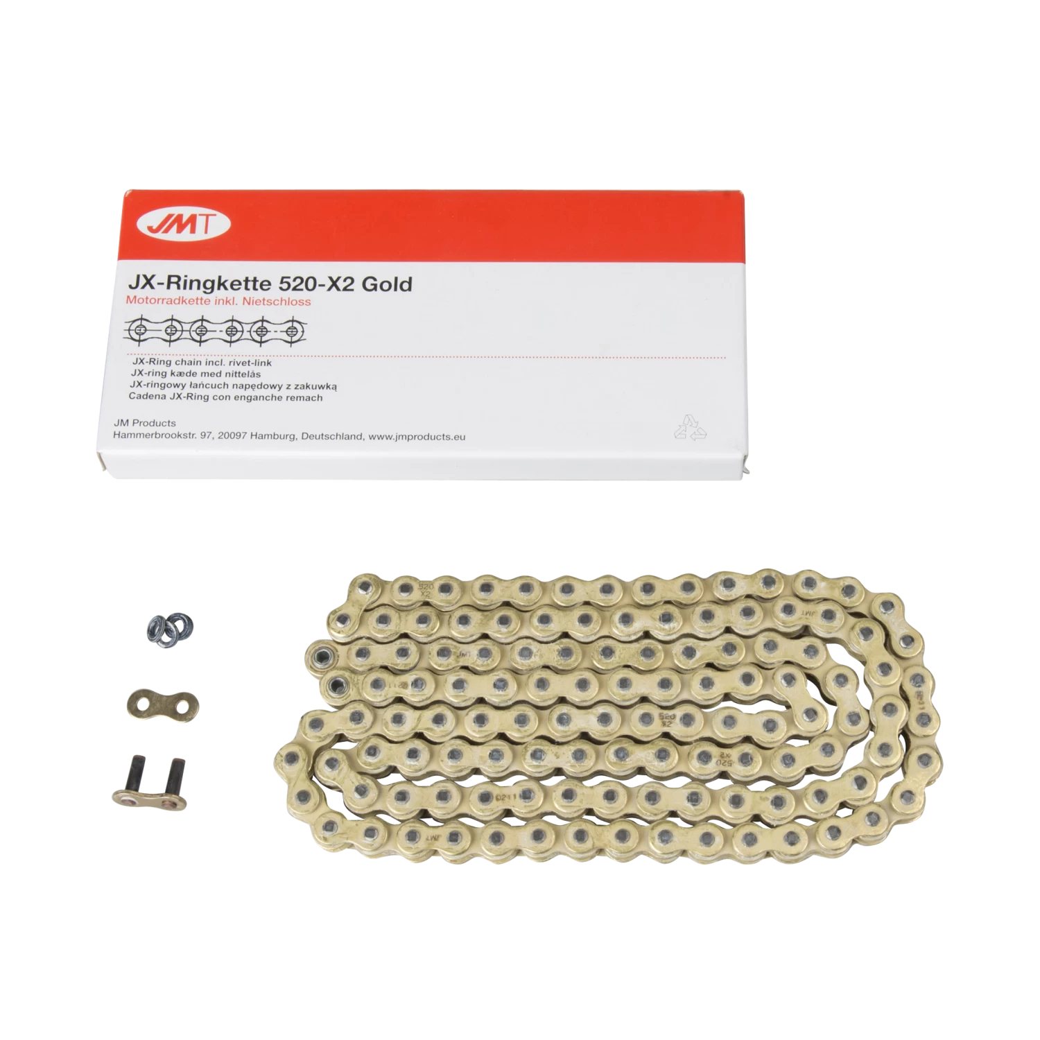 JMT’s gold-coloured 520X2 X-ring chain seals in lubricant and prevents dirt and debris from infiltrating the links, which effectively minimises friction. Due to its unique construction, this chain has a much longer service life than standard and O-ring chains.