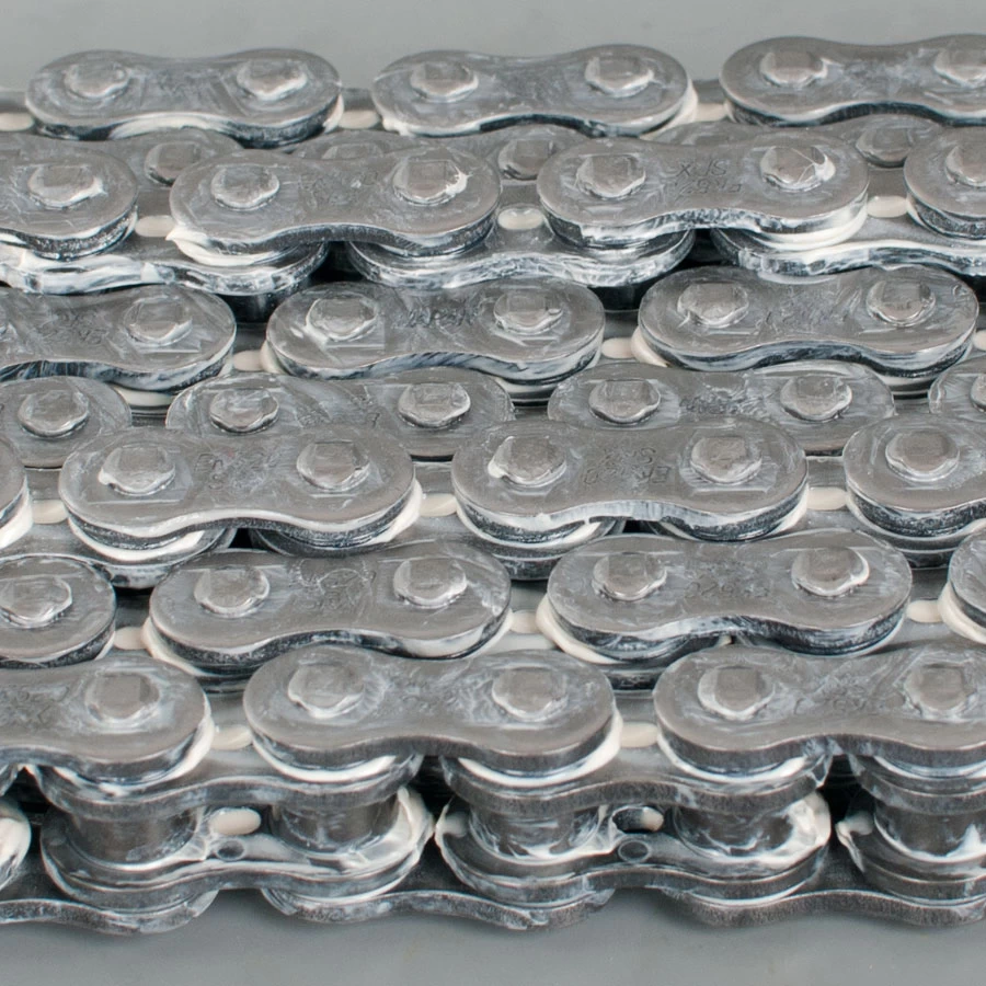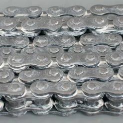 The chain has weight reducing holes in the links to reduce the chain’s overall weight by about 3% without sacrificing tensile strength.