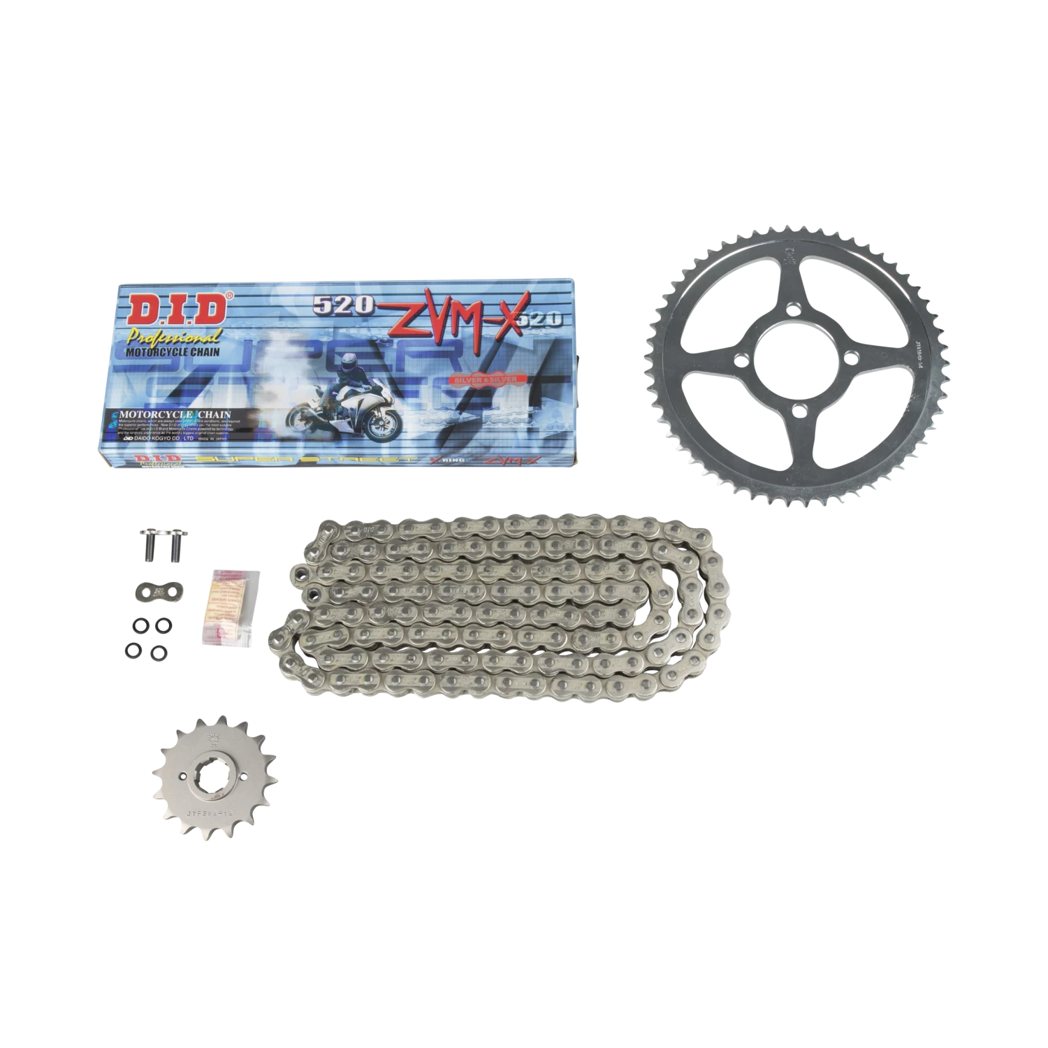 The JT/D.I.D sprocket includes a steel rear sprocket, a steel front sprocket and a reinforced 530 standard chain. The sprockets are made by JT and X-Ring chain are made by the Japanese D.I.D!