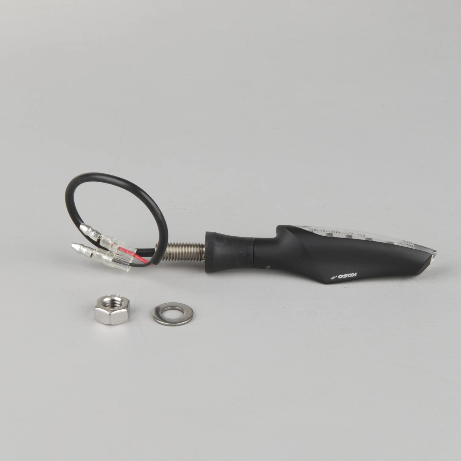 Mini LED indicators from KOSO! Made with clear glass and orange diodes for a modern look without compromising visibility. The indicator heads are made of black metal, while the arms are made of rubber for better security.