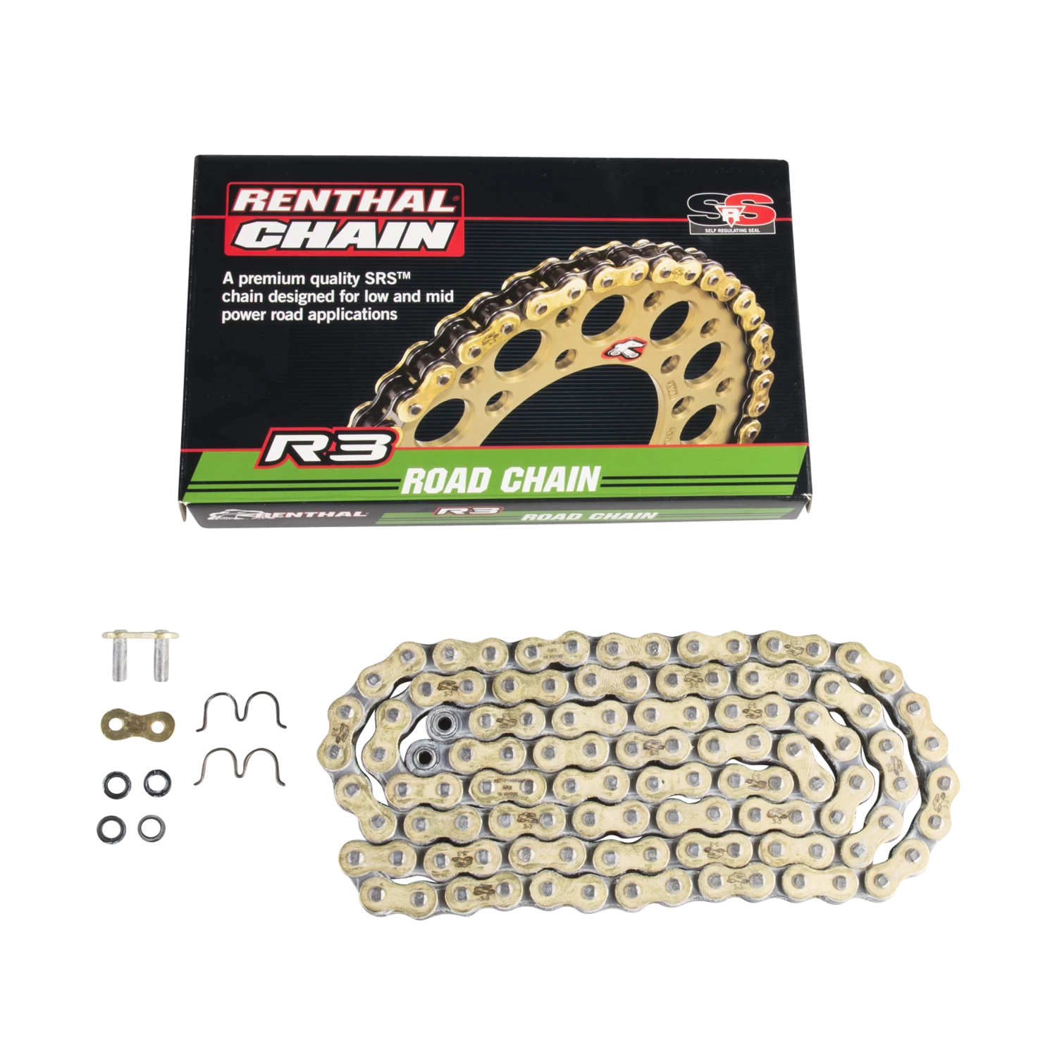 Renthal Works 520R3 O-ring chain. The chain is incredibly strong with a light weight and a long service life that provides maximum transmission of power. Designed as a versatile chain to apply to both off-road and off-road riding up to 650cc.
