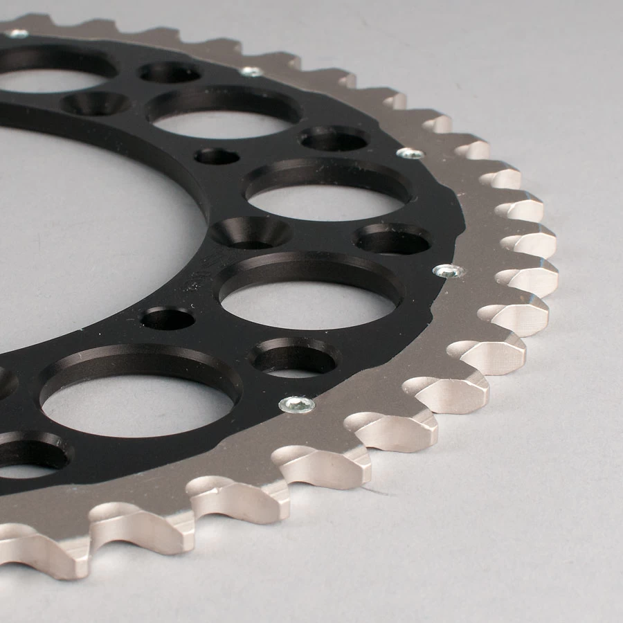 This heat induced fitting technique uses expansion and contraction combined with a wave pattern to ensure a solid bond between the rings. The flat socket head screws add additional strength to the chain wheel during side impact.