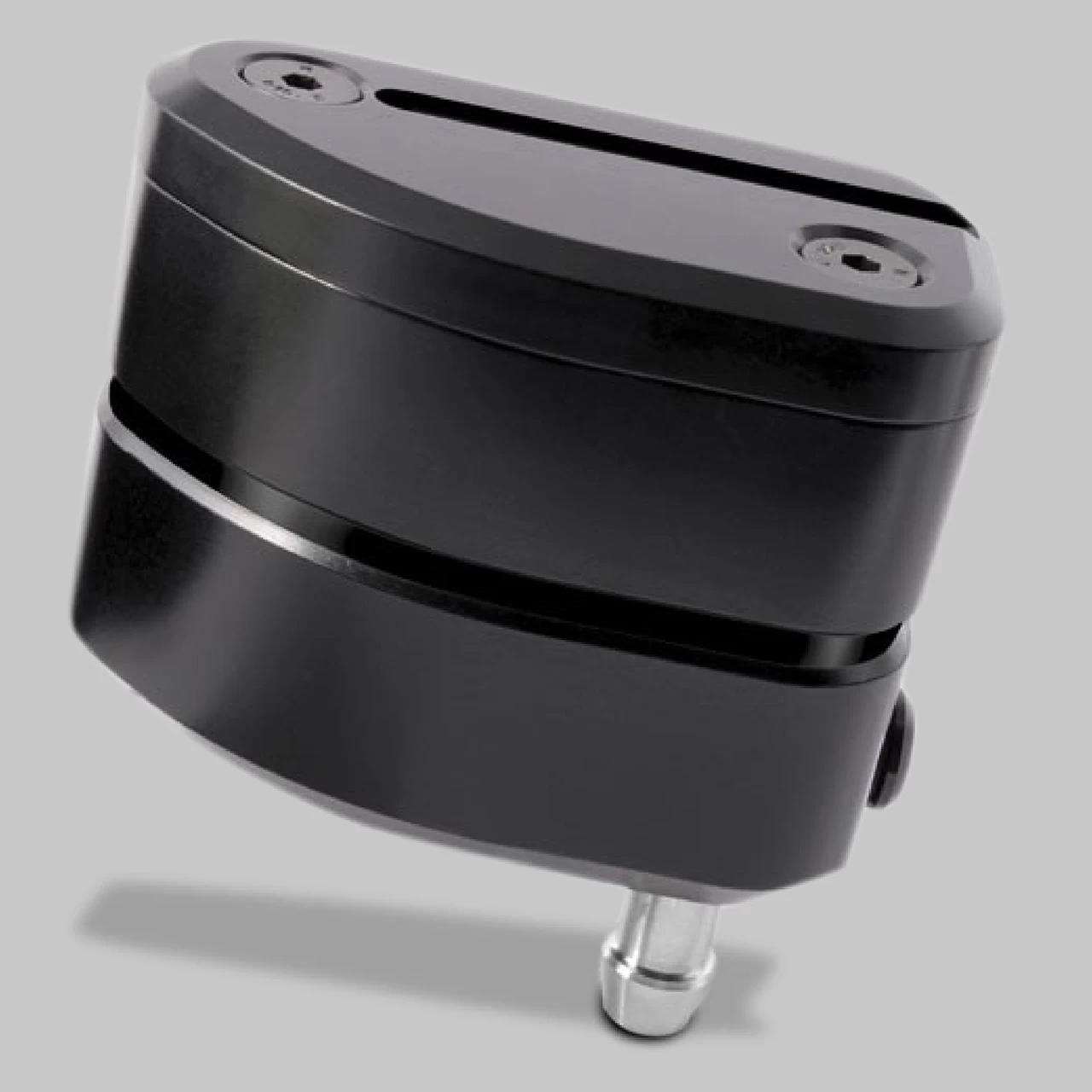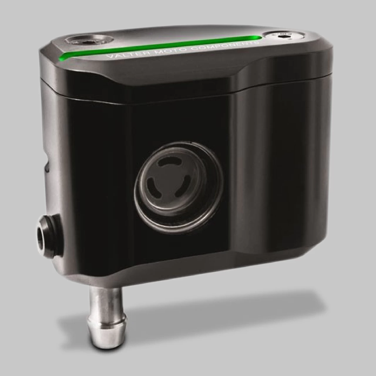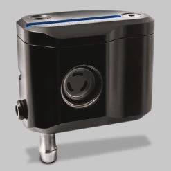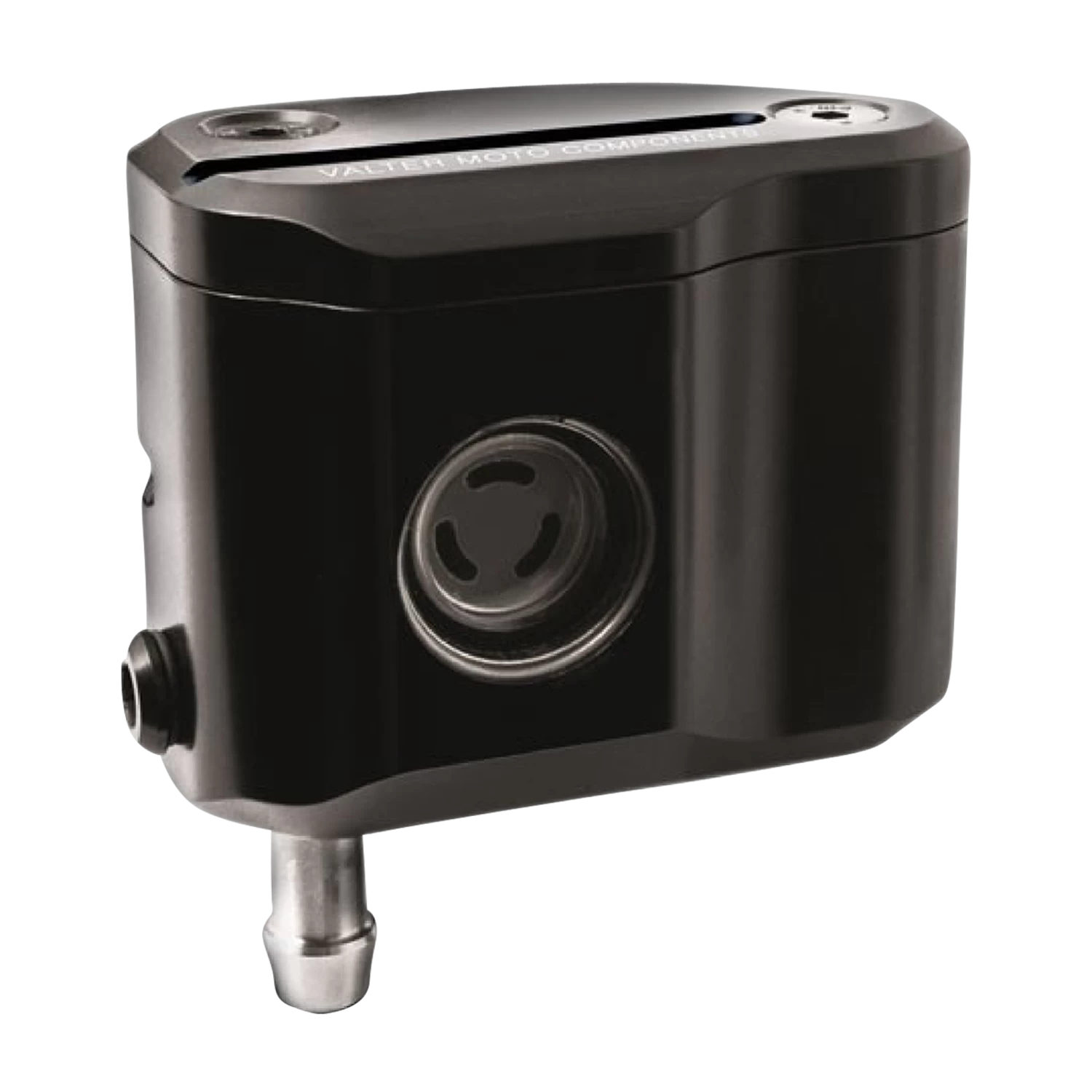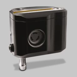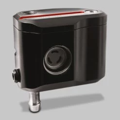 This Street brake oil tank is made completely from aluminium alloy that is CNC machined to the highest level of quality. Made on a VMC design it is available in black with coloured inserts. On one side is the window for checking the oil level. Two different outlet pipe connections, one on the side and one on the bottom. The aluminium cap is also black with coloured inserts.
