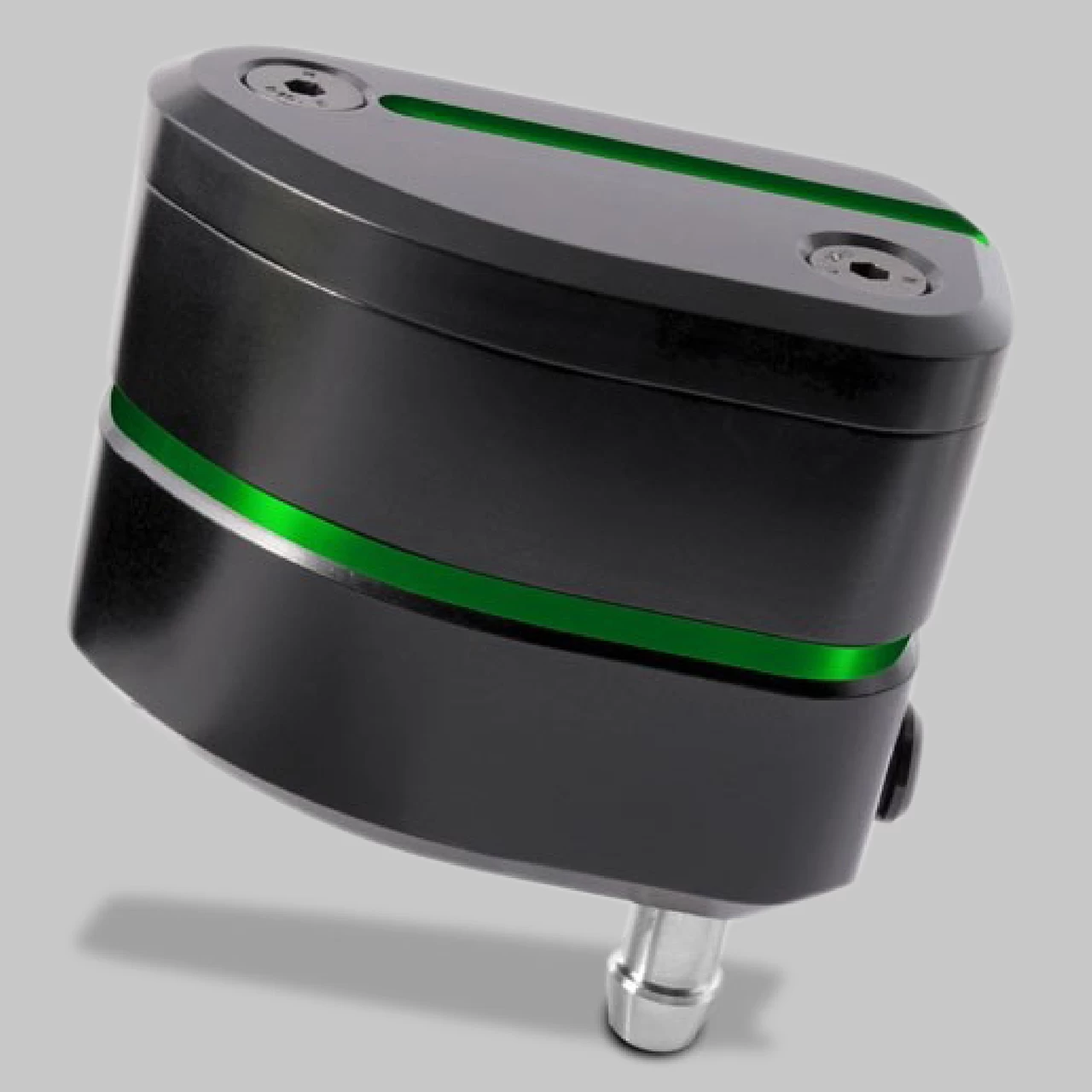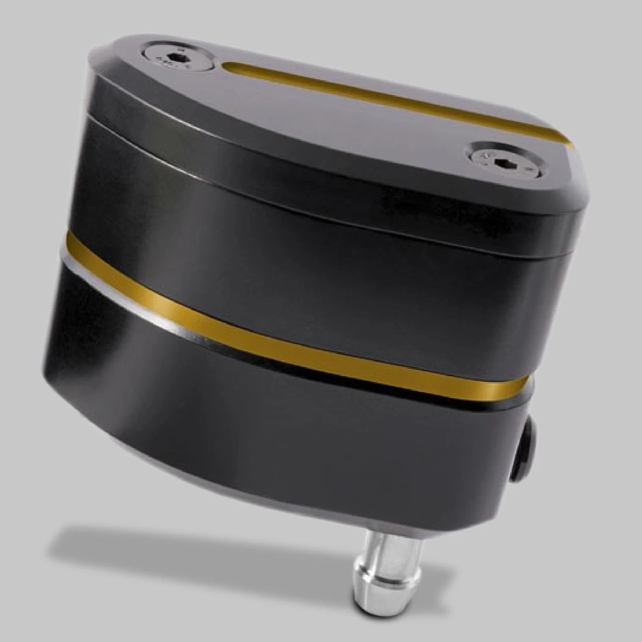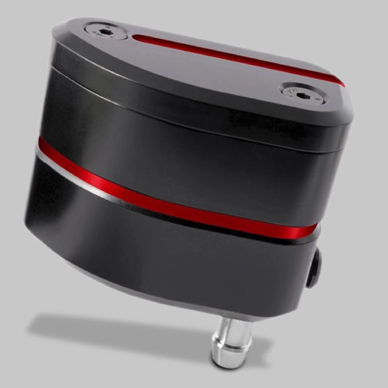 This Street brake oil tank is made completely from aluminium alloy that is CNC machined to the highest level of quality. Made on a VMC design it is available in black with coloured inserts. On one side is the window for checking the oil level. Two different outlet pipe connections, one on the side and one on the bottom. The aluminium cap is also black with coloured inserts.